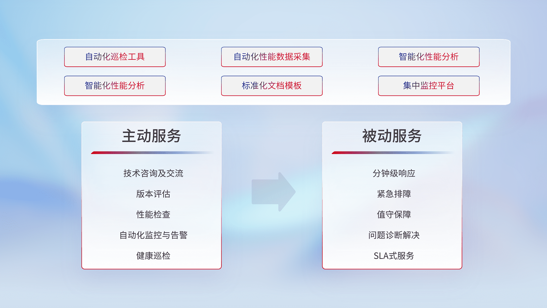 智能化工具和标准化文档,,,保障服务质量,,,,提供主动服务(包含技术咨询、、版本评估、、、性能检查、、自动化监控与告警、、、健康巡检)和被动服务包含(分钟级响应、、、、紧急排障、、值守保障、、、、问题诊断解决、、、、SLA服务)。。
